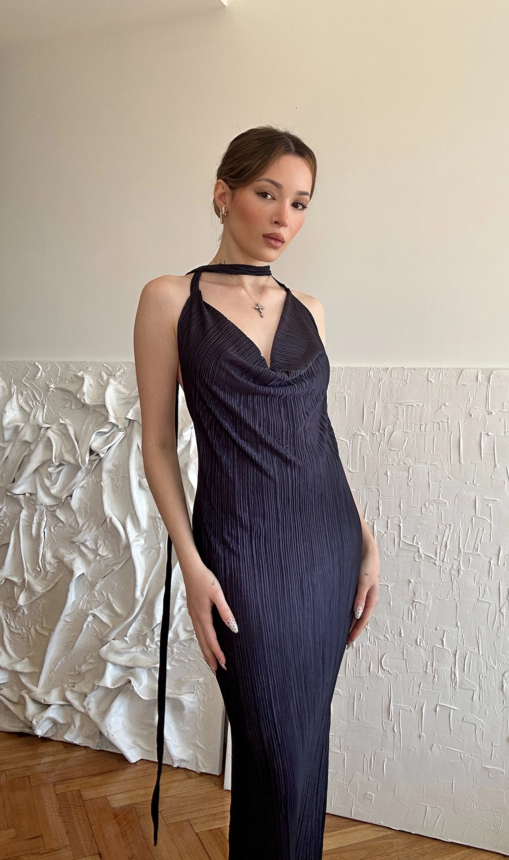 Vestido Sahara: Confeccionado en gasa plisada, escote buche, espalda descubierta y dos tiras largas para atar como mas te guste.
