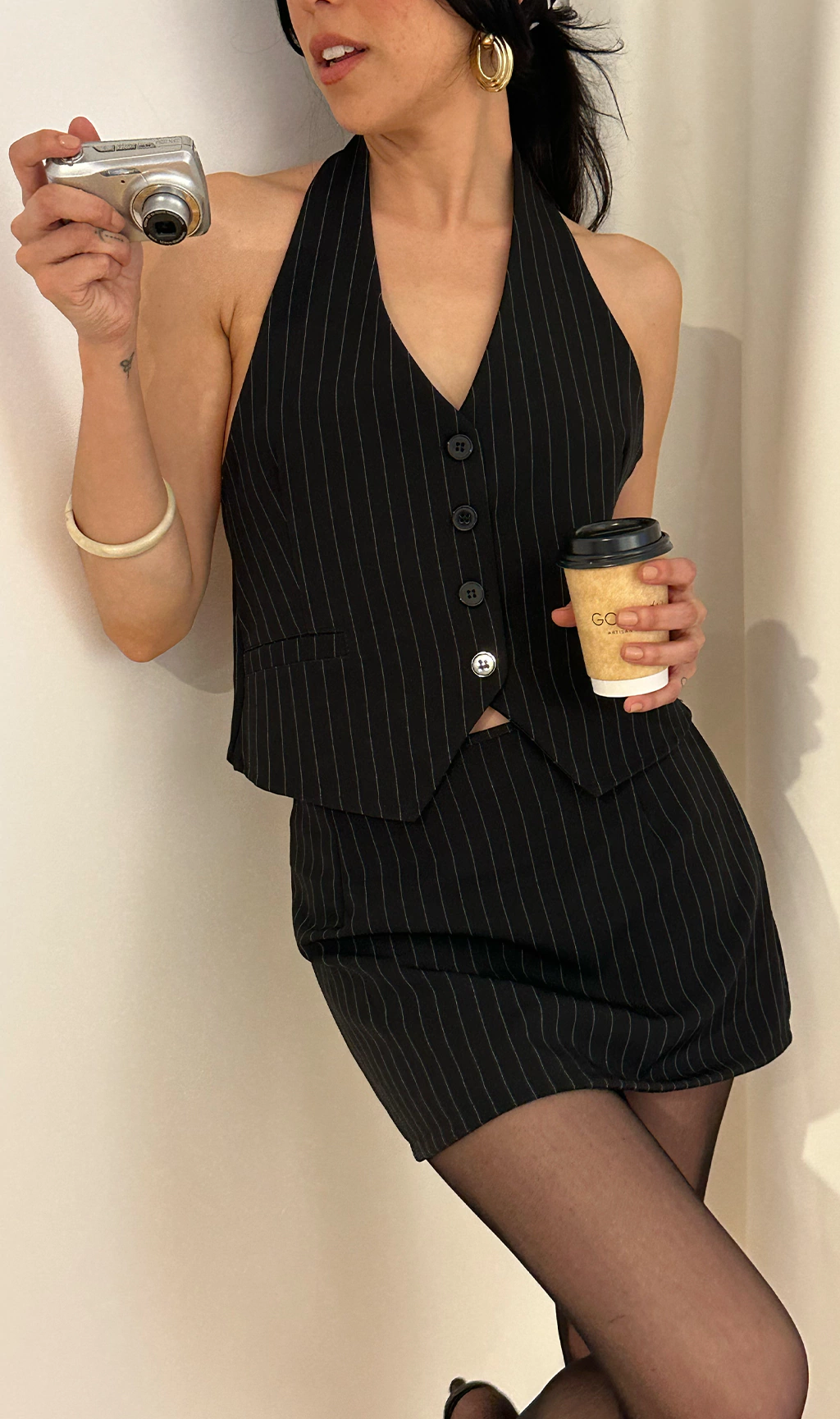 Stretch top made from a body-hugging material that adapts to your shape, featuring a tie-neck bow and adjustable straps at the back.